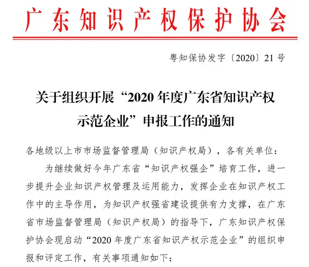 今年 “广东省知识产权优势企业”的评定将延续2019年度的评定规模,不设上限,鼓励全省符合条件的企业积极申报,并将通过审核的企业积极申报,并将通过审核的企业由省局优先推荐申报当年的“国家知识产权优势企业”(深圳地区企业由深圳市局推荐,推荐标准按深圳市局规定)。